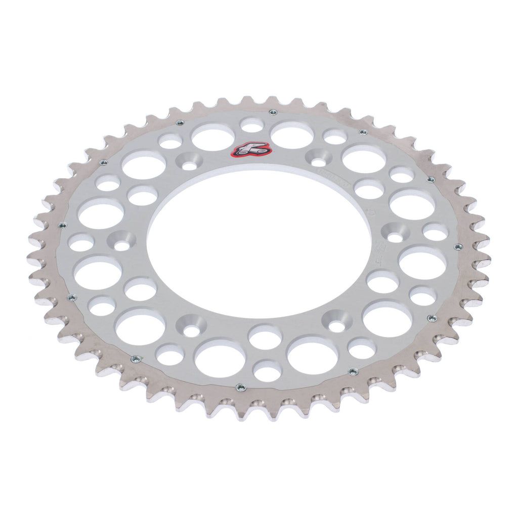 The Renthal Twinring Rear Sprocket is a long-lasting durable Off-Road sprocket that was developed and tested over the course of 5 years. The unique flat face two-piece design keeps weight to a minimum and maximizes durability all while keeping a narrow profile. The outer steel ring is expanded at 200°C and then fitted to the aluminium inner before cooling, this process creates a permanent bond while flat socket set screws prevent lateral movement between the rings.