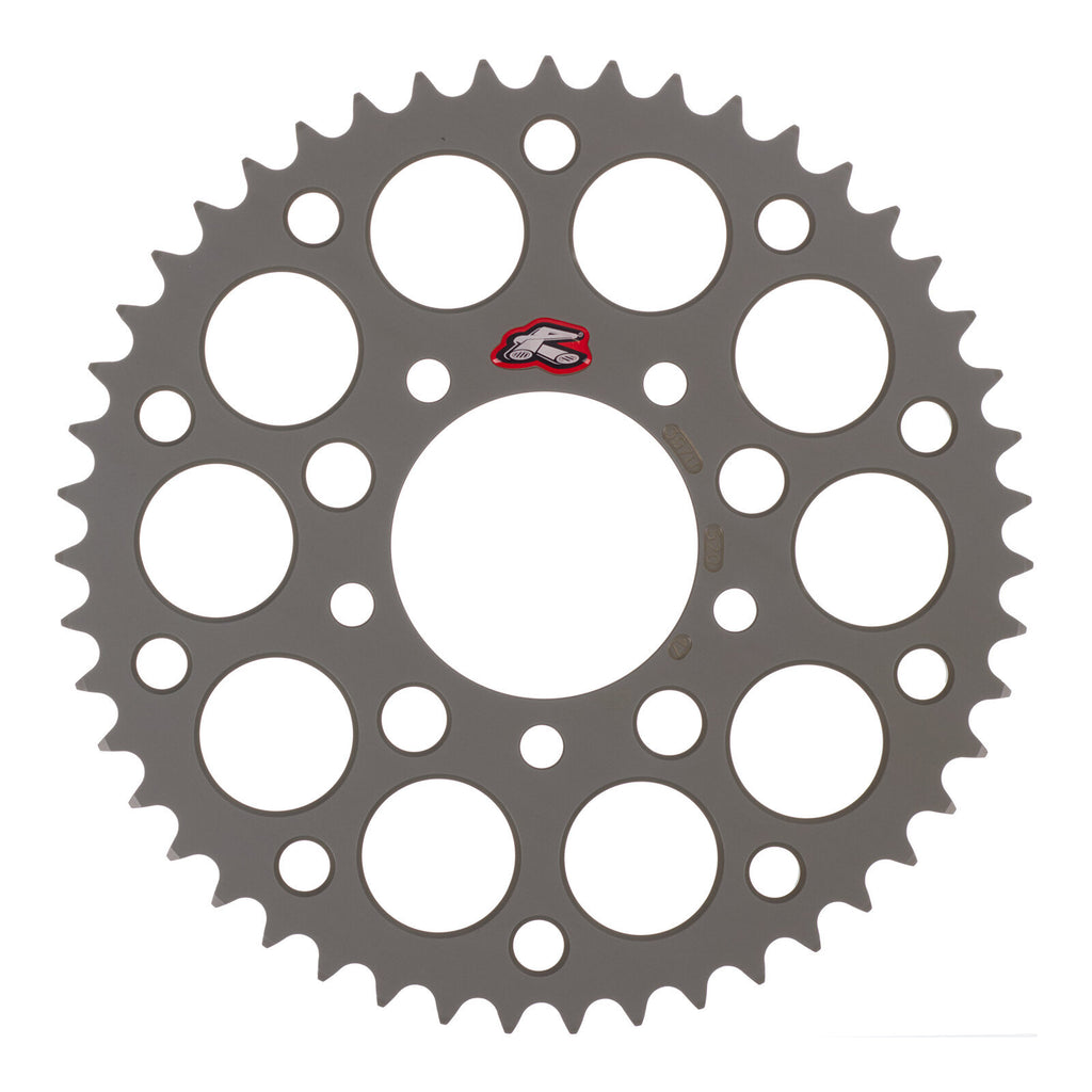 Renthal hard anodised rear sprockets are precision CNC manufactured to extremely high tolerances. The high strength is especially enhanced by using a 7075 T6 aluminium alloy coated in an ultra-hardwearing finish for extreme mileage. The rear sprockets computer-aided design gives the maximum reduction of unsprung weight at the rear wheel, to give maximum power transfer. The Renthal rear sprockets are 33% lighter than steel and the self-cleaning mud grooves prevent dirt buildup and help keep the sprocket clean.