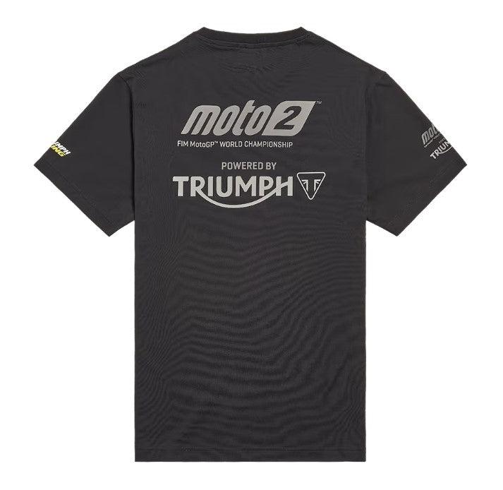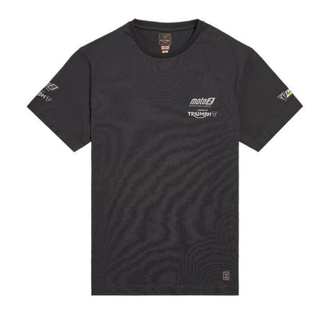 A 100% soft cotton 160g weight classic fit crew neck tee in black featuring the official Triumph engine supplier logo to Moto2™ printed on the back of the tee with a smaller logo on the chest and the top of each sleeve. Beautiful looking shirt