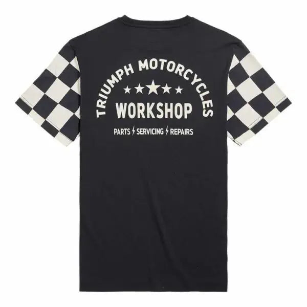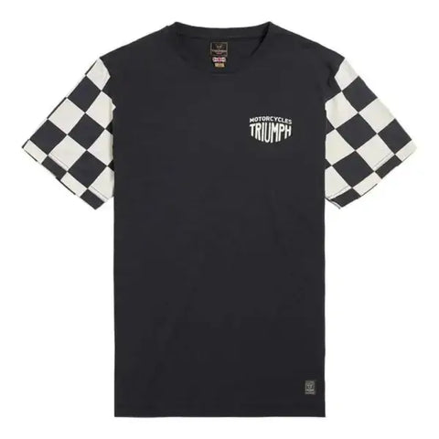 Soft 100% Cotton tee in Black, with Black/Bone chequered flag short sleeves, stylised Triumph Motorcycles print to left chest, signature woven badge at left hip and Triumph Workshop arched logo design in Bone soft-touch print to the rear.