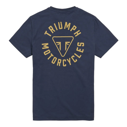 Soft 100% cotton tee in Black Iris (indigo blue) with a classic patch chest pocket bearing Triumph roundel printed design on the front, featuring a larger roundel print on the back.