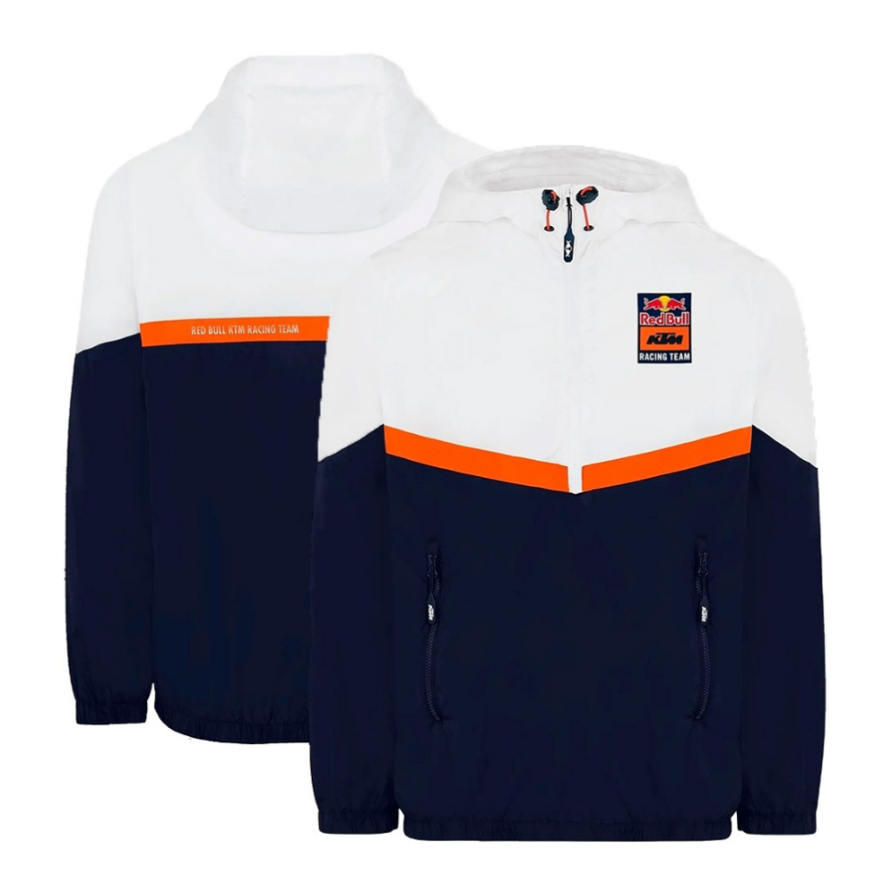 Whether you’re at the track, on the daily commute or embracing the adventure, this stylish Red Bull KTM Racing Team windbreaker will keep the chill at bay. Created in functional but comfortable polyamide, it features a standout color block design, offset by Red Bull KTM Racing Team branding on the chest and back to show your pride. On the practical side, the half-zip neck offers versatility, while the adjustable hood and hand pockets will lock in warmth just when you need it.